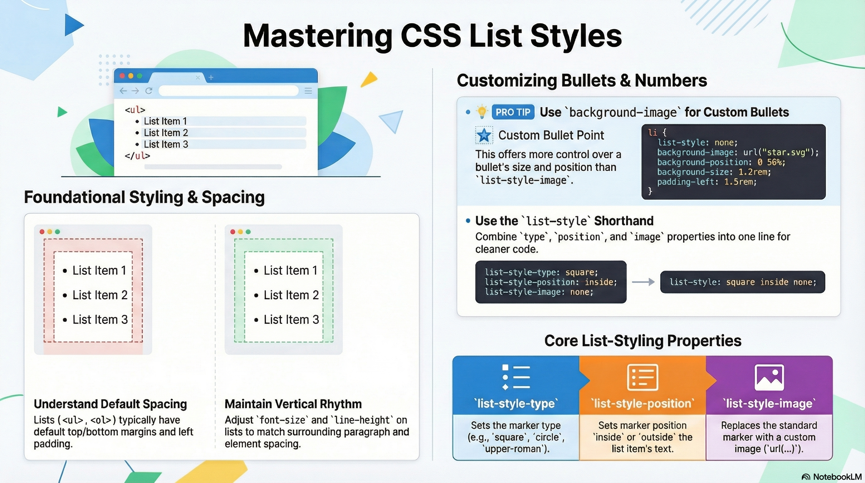 When styling lists, you need to adjust their styles so they keep the same vertical spacing as their surrounding elements (such as paragraphs and images; sometimes called vertical rhythm), and the same horizontal spacing as each other.