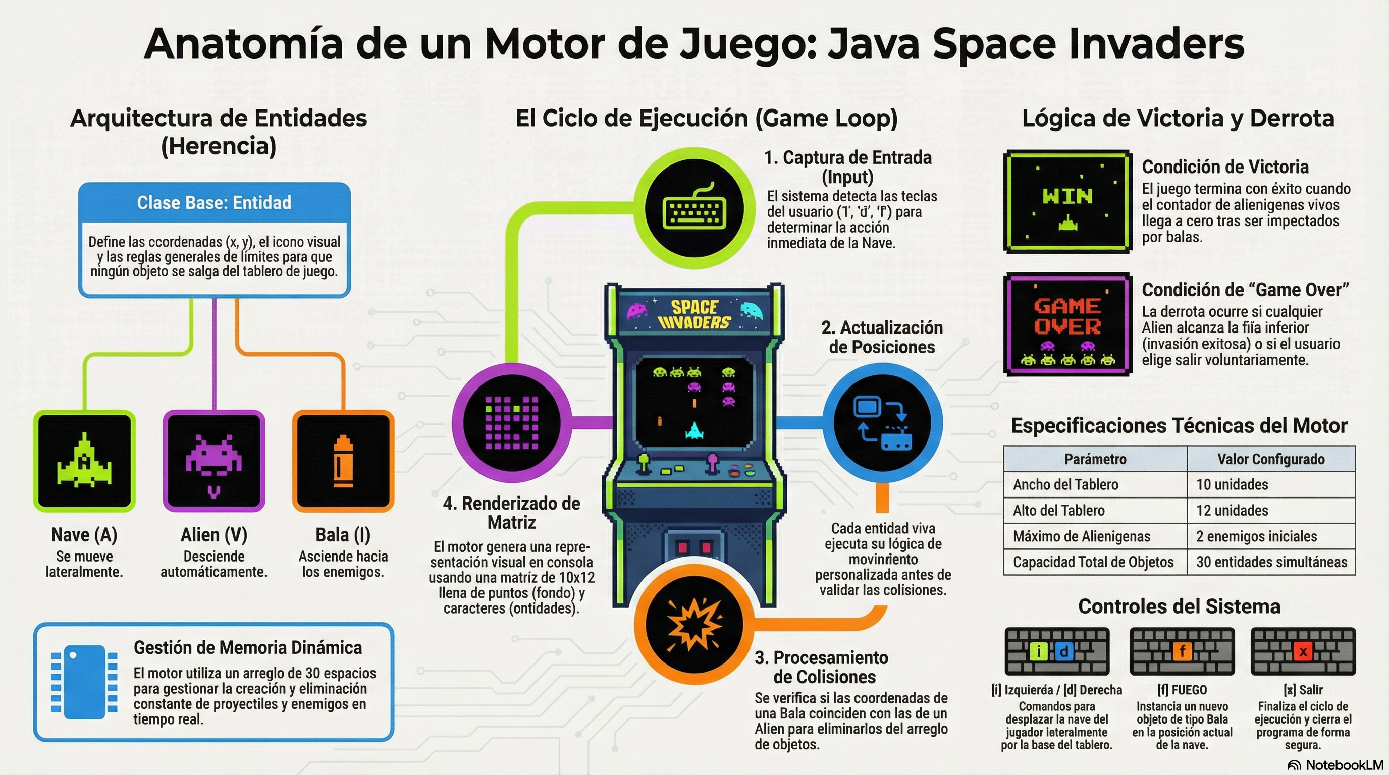 El Bucle de Juego (Game Loop) es infinito (while(jugando)) y sigue estos pasos: