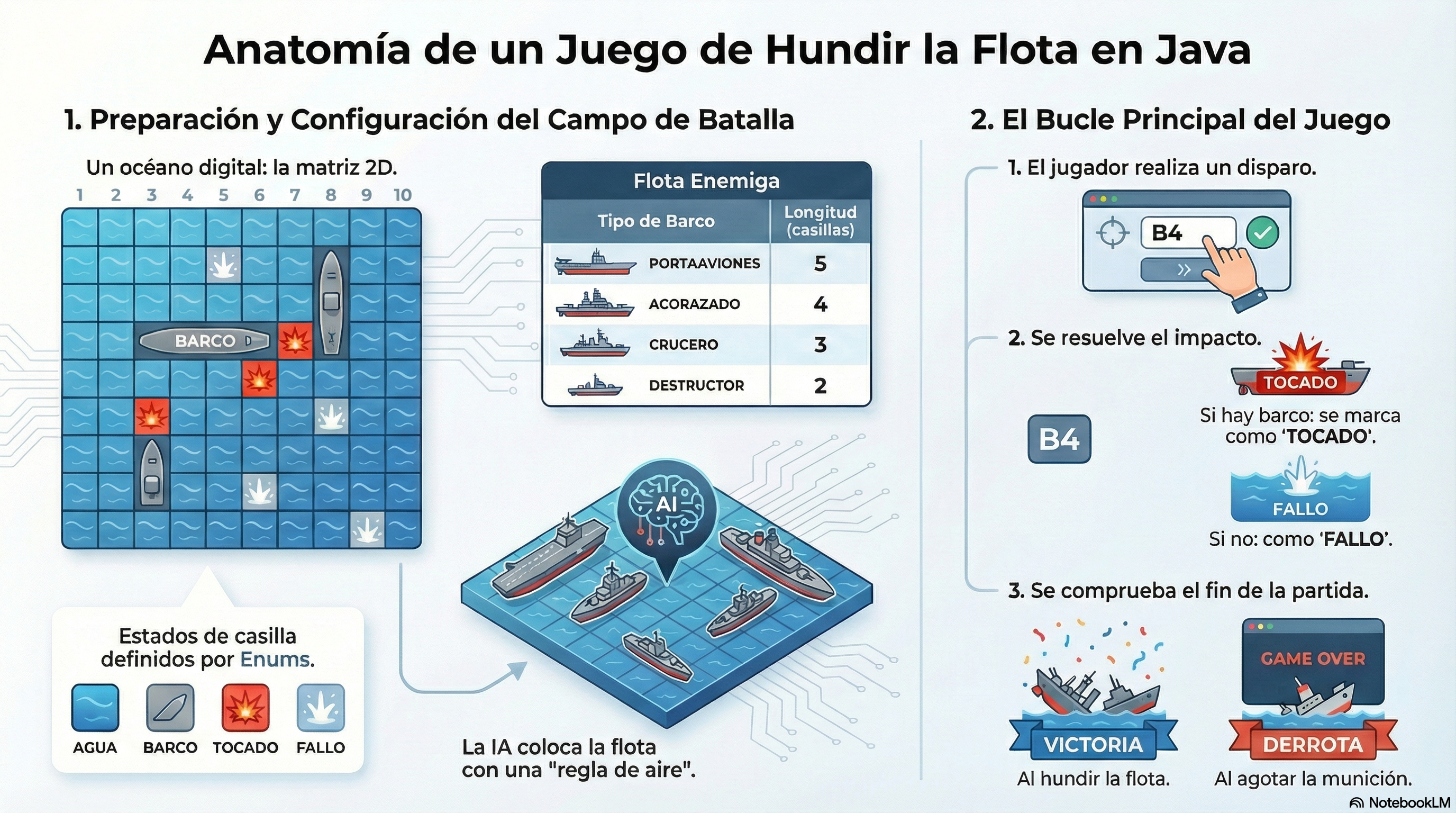 * El objetivo es encontrar todos los barcos enemigos ocultos en el tablero